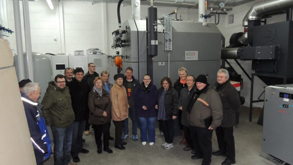 Der Geschäftsführer der Wohnungsbau-GmbH, Reiner Hofmann (Siebter von rechts) erläuterte Anliegern und den CSU-Kandidaten die neue Heizzentrale. Herzstücke sind die Hackschnitzlheizung mit Filter sowie das gasbetriebene Blockheizkraftwerk (rechts).
